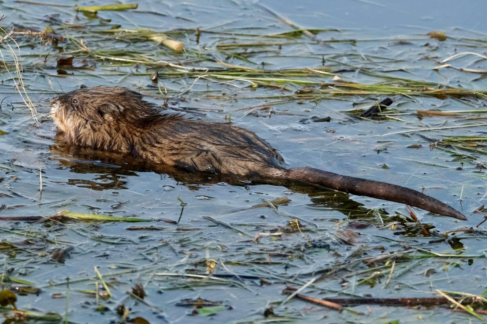 Muskrats are sizable aquatic rodents measuring up to 2 feet in length including their tails, and weighing up to 4 pounds. Their fur is usually dark brown, with a lighter underside. They possess small eyes and ears, short front legs, and longer hind legs, along with five clawed toes on each foot; their back feet are webbed, making them well-adapted for aquatic life.